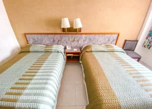 Consta de dos camas queen size con una ocupación máxima de 4 personas (incluyendo entre niños y adultos) Los servicios en habitación wifi, agua caliente las 24hrs, TV con servicio de cable, aire acondicionado